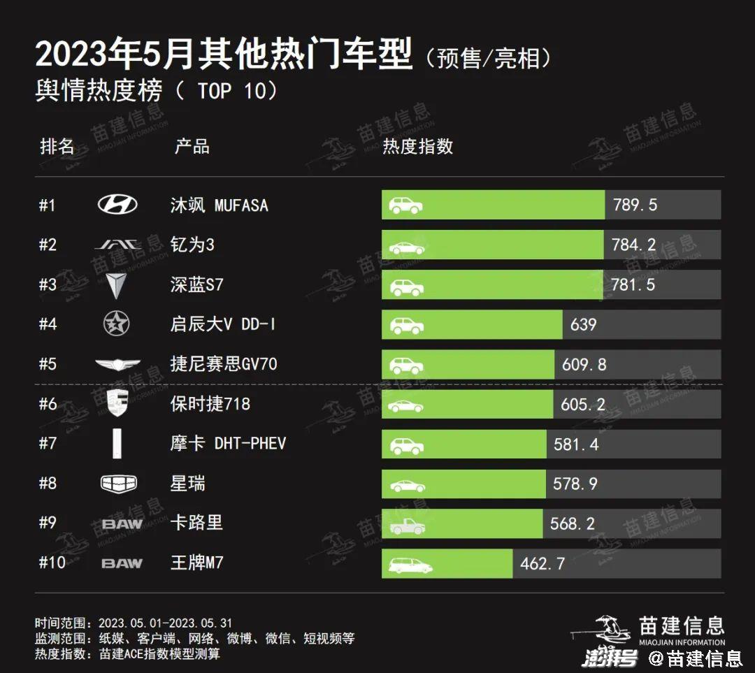 According to the statistics of Miaojian Information Public Opinion Monitoring Platform, in the TOP10 public opinion hot list of new cars listed in May, domestic brands dominated, and among the new cars listed, fuel/plug-in models accounted for over 60%.