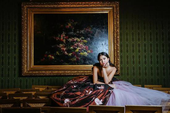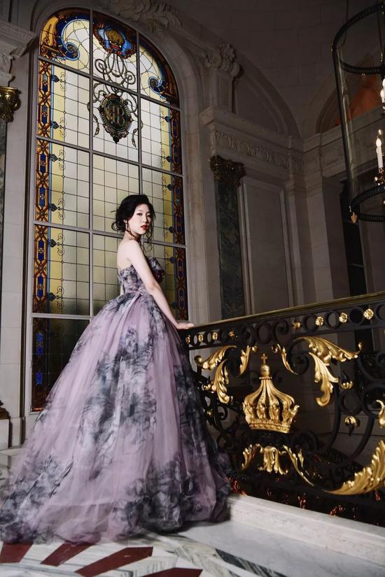 At the dance, she wore Guo Pei’s gray-purple high-cut dress and pretended to be serious with her partner for another second.