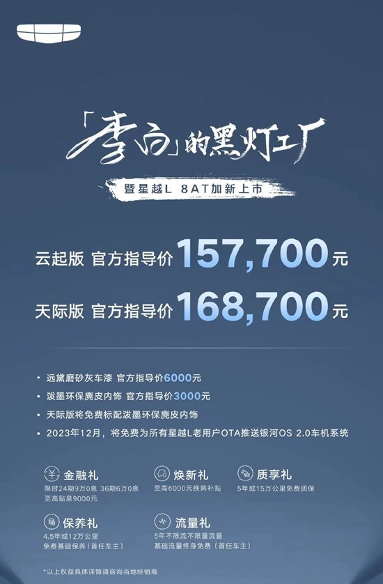 On September 17, Chezhi. com learned from relevant channels that the new Geely Xingyue L was officially launched. As an annual redesigned model, there are two new models to choose from, and the price range is 157,700-168,700 yuan.