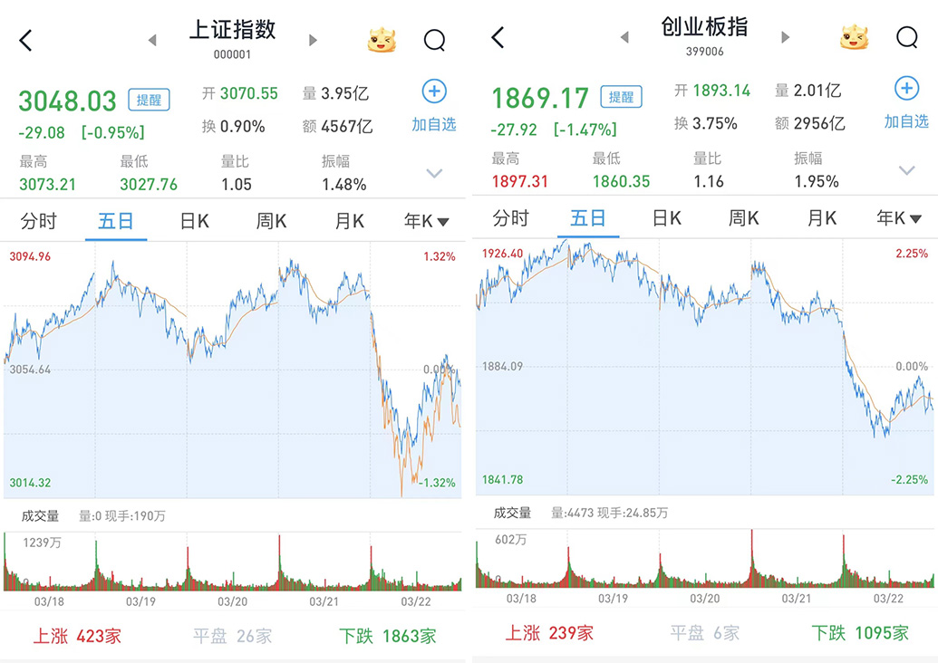 By the close of March 22, the Shanghai Composite Index fell 0.95% to 3,048.03 points; The Science and Technology 50 Index fell 1.48% to 794.2 points; Shenzhen Component Index fell 1.21% to 9565.56 points; The growth enterprise market index fell 1.47% to 1869.17 points.
