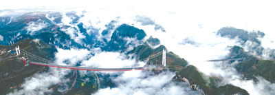 In Jishou City, Xiangxi Tujia and Miao Autonomous Prefecture, Hunan Province, the Aizhai Extra Large Suspension Bridge is surrounded by clouds, which is beautiful. Photo by Liu Zhenjun (People’s Vision)