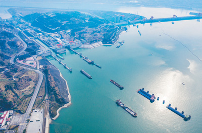 Ships are sailing in an orderly way in the upstream approach channel of the five-level lock of the Three Gorges Project. Photo by Zheng Jiayu (Xinhua News Agency)