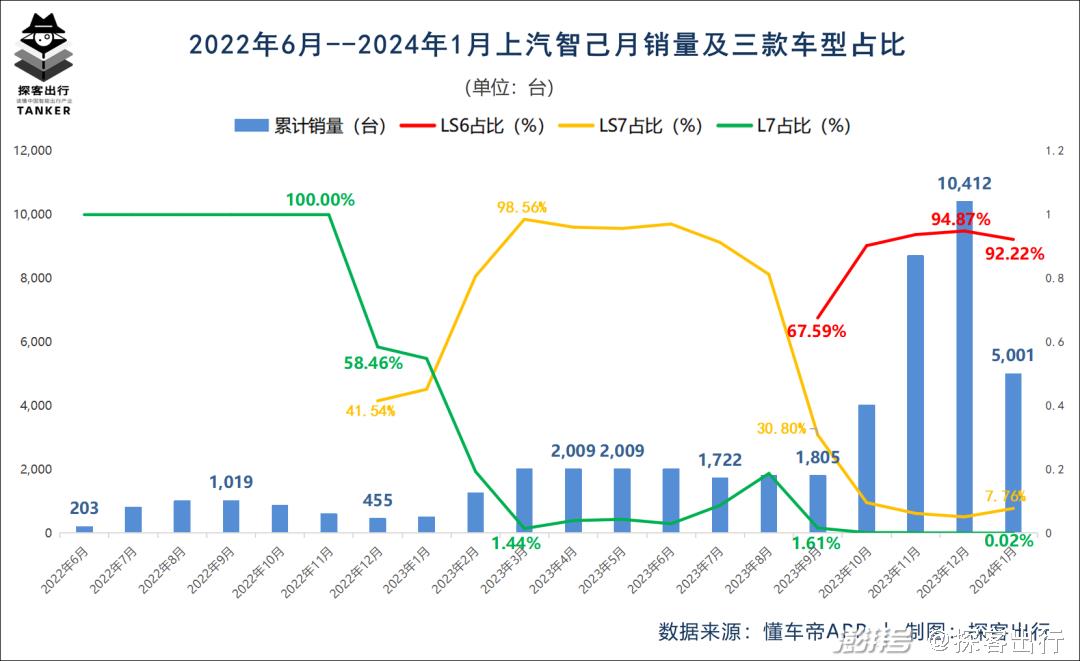 Dcar data shows that in January 2024, the Zhiji car brand sold about 5,001 units in a single month. Among them, Zhiji LS6 bicycles contributed 4,612 units, accounting for 92.22% of the total sales in the month. Zhiji LS7 sold only 388 units in a single month, accounting for about 7.76% of the total sales in the month. After four consecutive months of low single-digit sales, Zhiji L7 sold only one new car in January, accounting for as low as 0.02%.